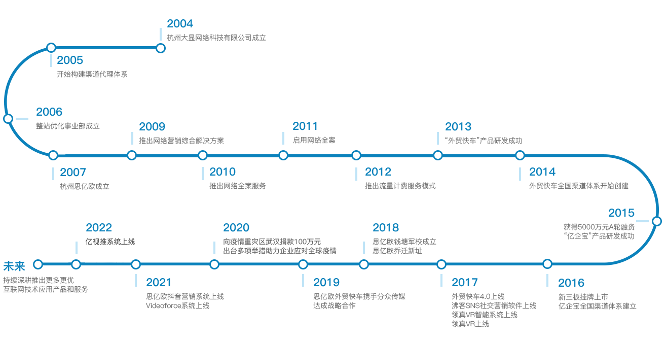 公司于2009年推出了網(wǎng)絡(luò)營(yíng)銷綜合解決方案,于2013年底成功研發(fā)了針對(duì)外貿(mào)企業(yè)的網(wǎng)絡(luò)營(yíng)銷產(chǎn)品外貿(mào)快車,并于2014年初推向市場(chǎng),2015年建成全國(guó)渠道體系和客戶服務(wù)體系。思億歐旗下子公司大顯科技隆重推出面向國(guó)內(nèi)中小內(nèi)貿(mào)企業(yè)網(wǎng)絡(luò)營(yíng)銷綜合解決方案產(chǎn)品億視推。