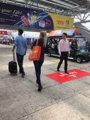 終于鼓起勇氣和這位歐洲美女合影,smile,大拇指,橙色大袋子