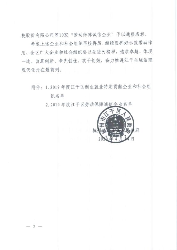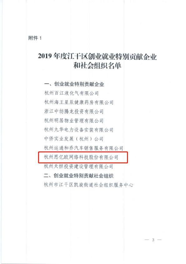 近日,杭州市江干區(qū)人民政府發(fā)布的《杭州市江干區(qū)人民政府關(guān)于表?yè)P(yáng)2019年度創(chuàng)業(yè)就業(yè)特別貢獻(xiàn)企業(yè)和社會(huì)組織、勞動(dòng)保障誠(chéng)信企業(yè)的通知》中,思億歐被授予“創(chuàng)業(yè)就業(yè)特別貢獻(xiàn)企業(yè)”并予以通報(bào)表彰。
